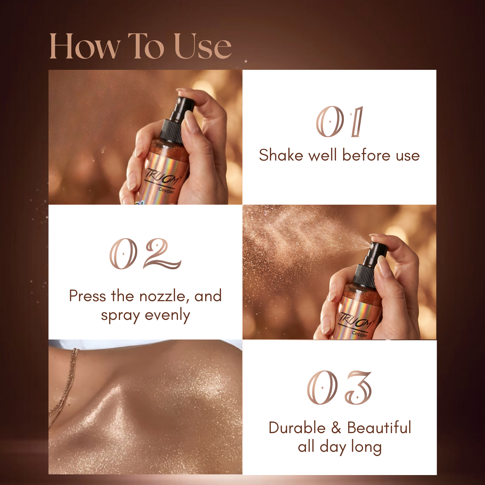 🌟 Use Copper Shimmer Spray as a final makeup touch to instantly brighten dull skin and boost confidence.